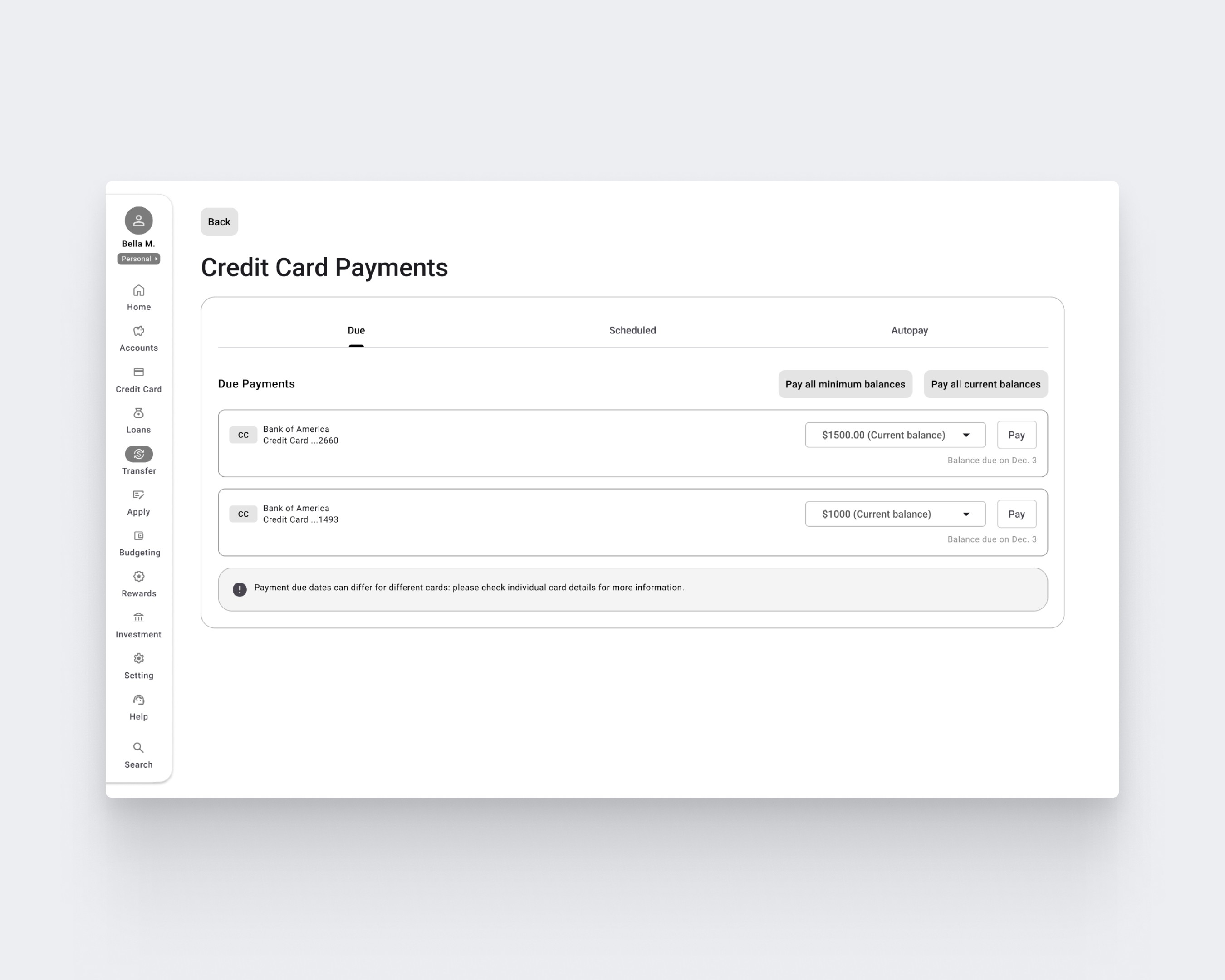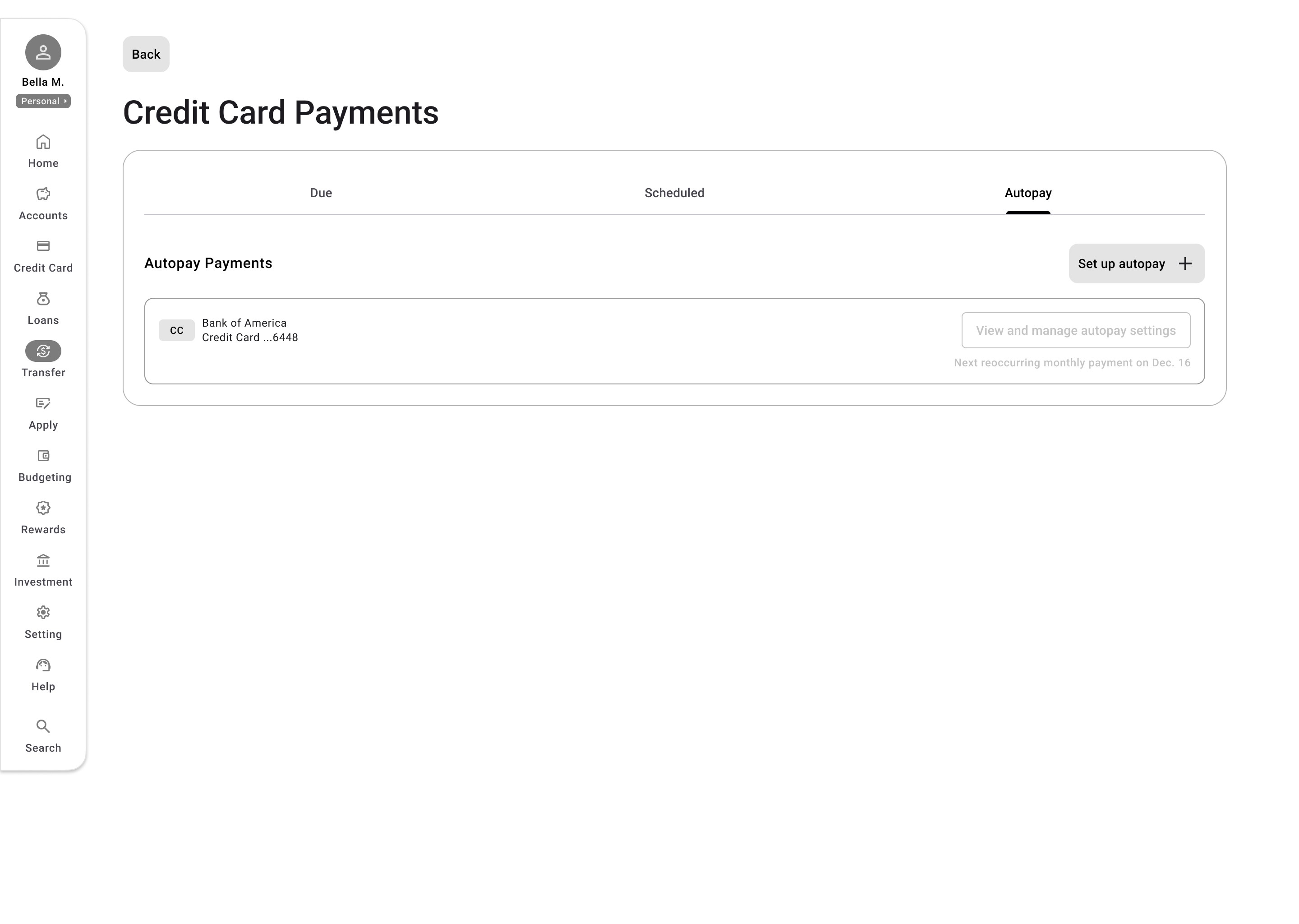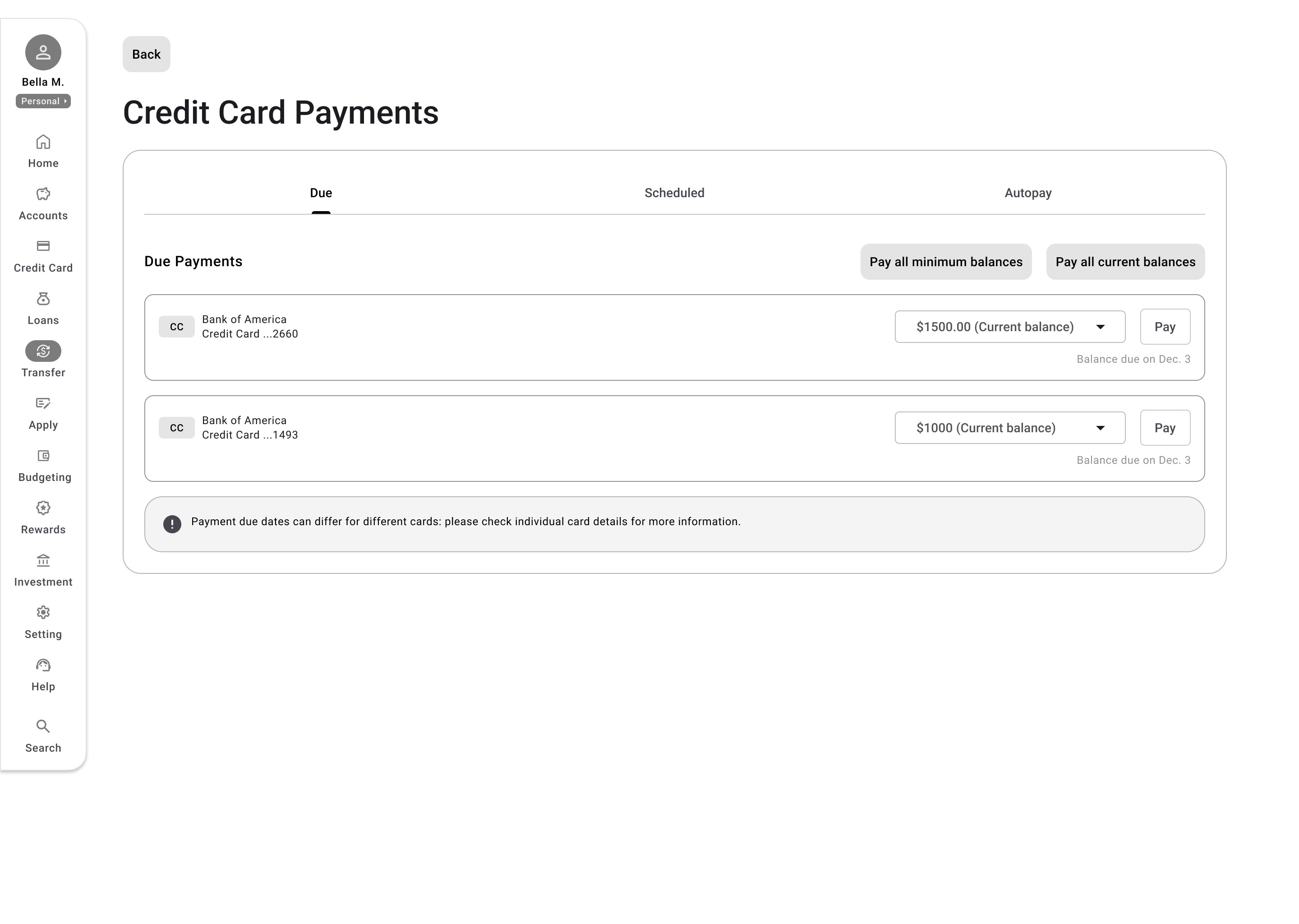 Reorganized credit card payment flow with 'due', 'scheduled', and 'autopay' tabs