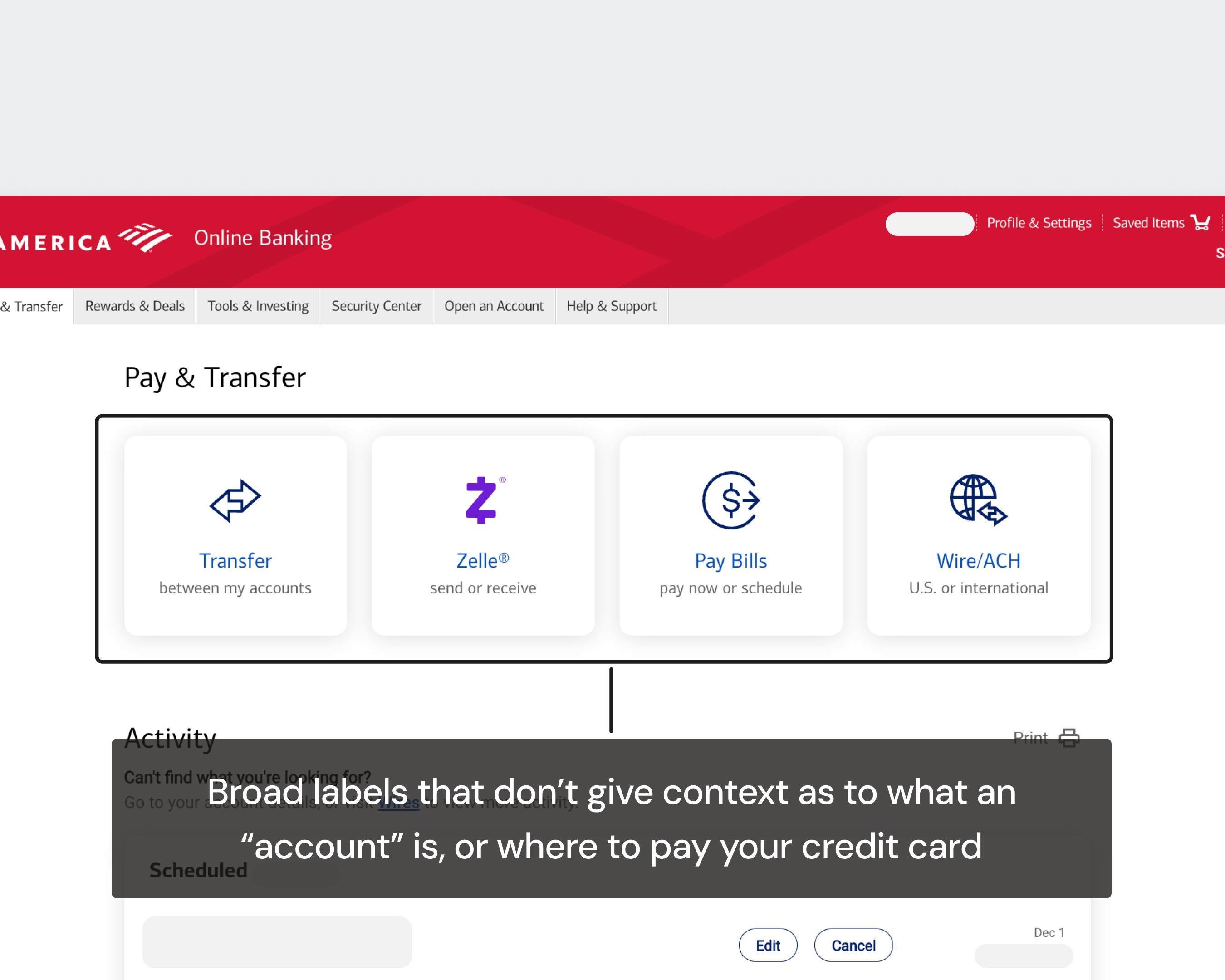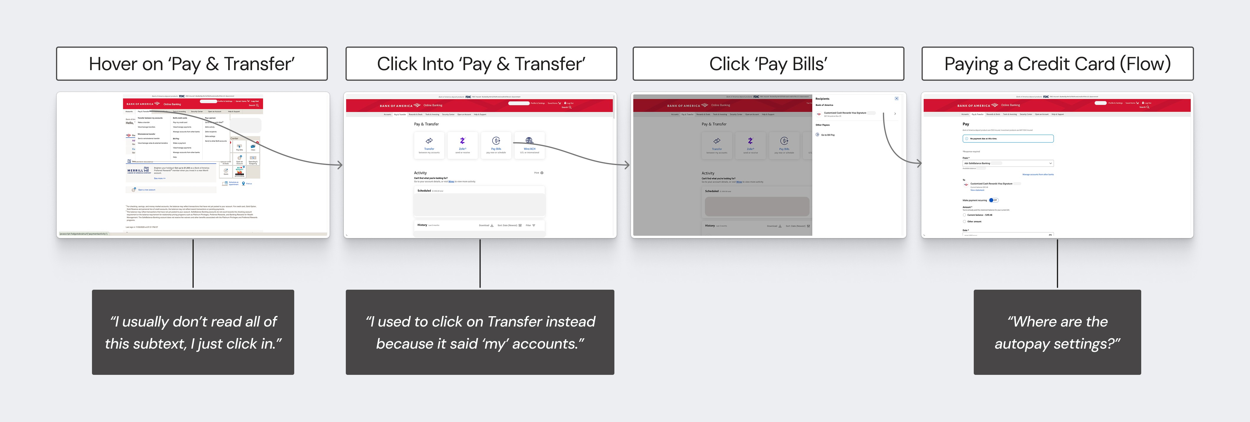 But it wasn't just me. A 2024 MeasuringU study analyzing six major U.S. banking websites found that clutter and poor navigation were the top drivers of user dissatisfaction, with BofA users specifically reporting confusion around payment flows and difficulty managing cards and finding features.