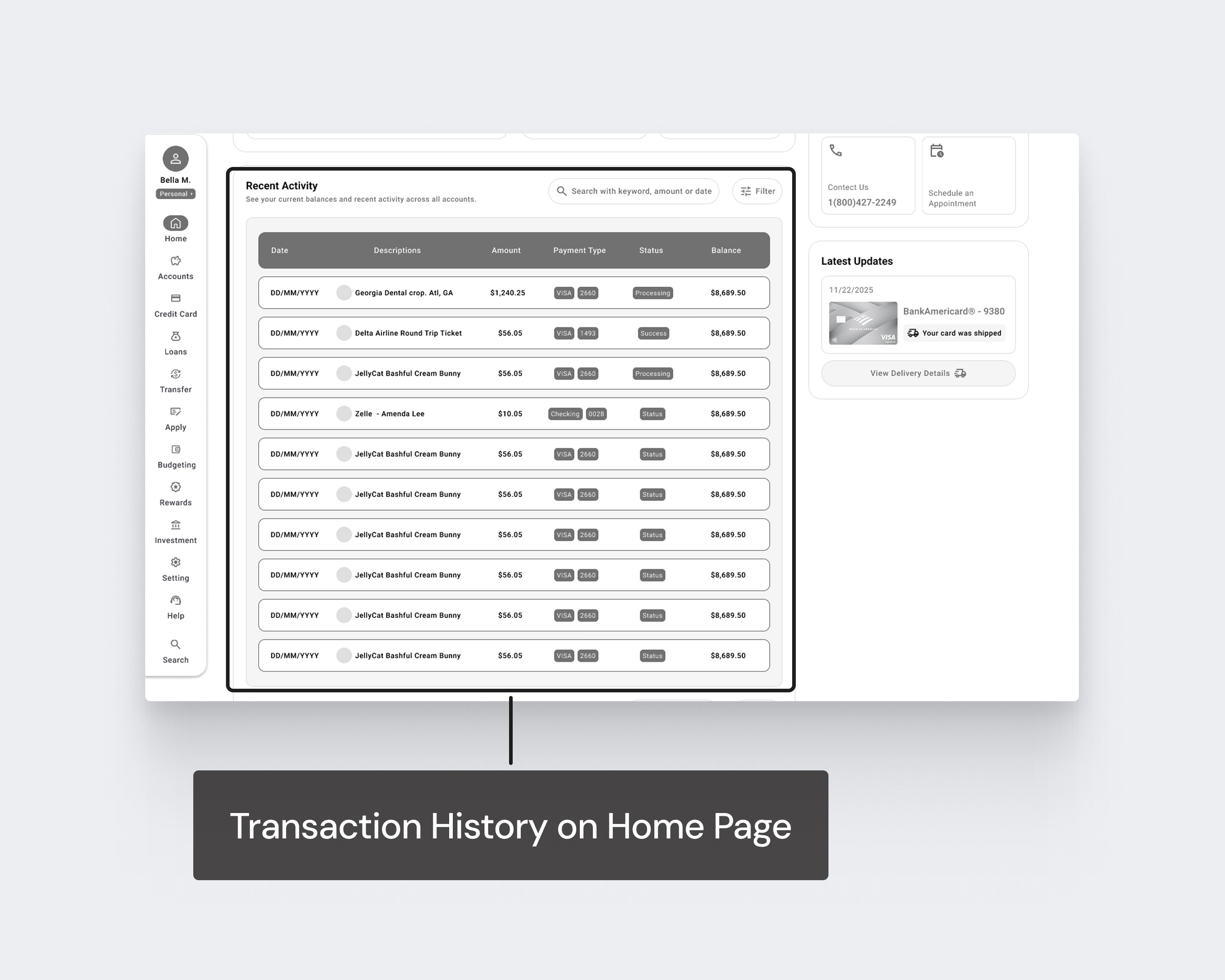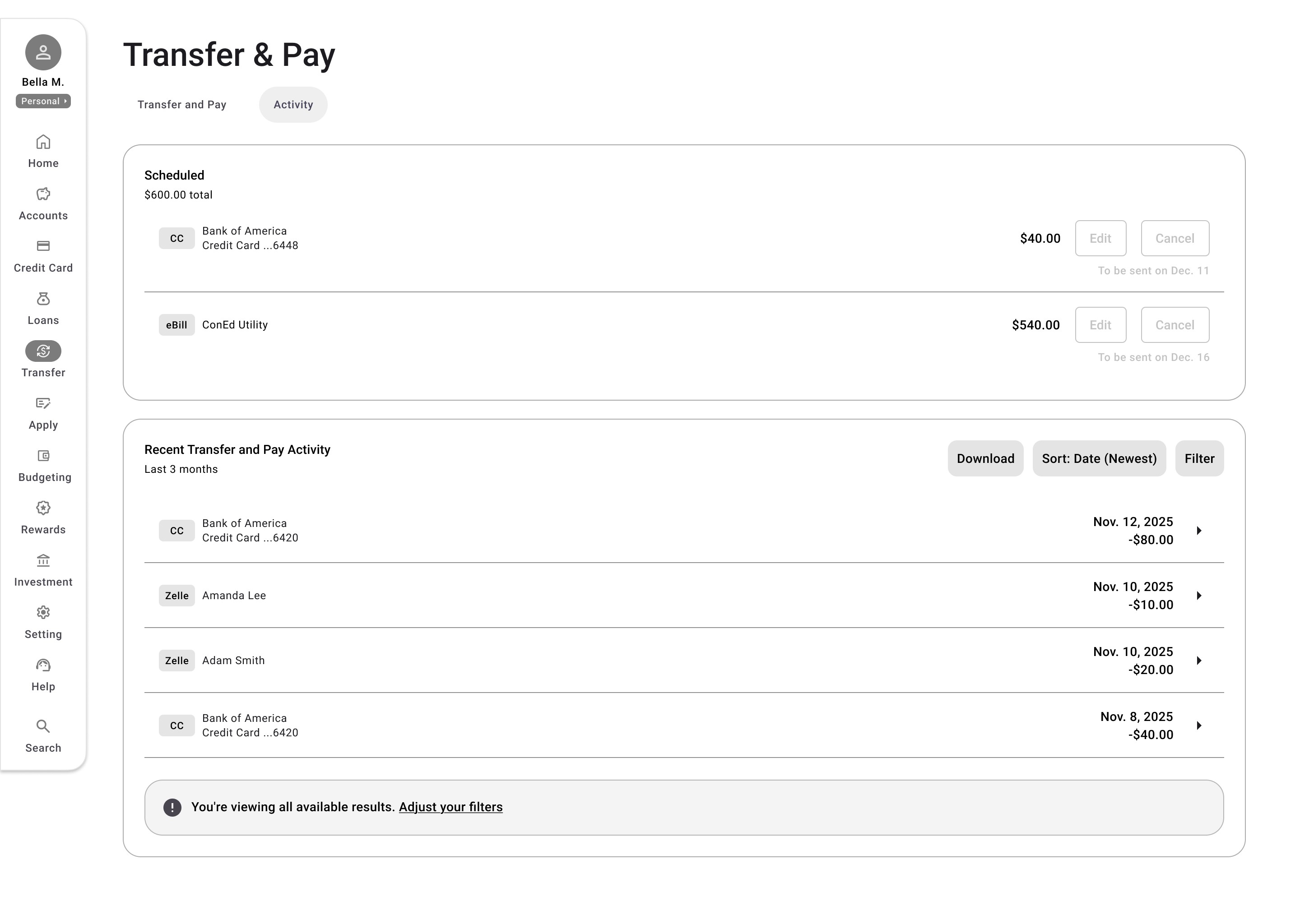 Mobile adaptation: We focused on desktop because it gave us a foundation to work from before deciding what to pare down for mobile. But 54% of users prefer mobile for day-to-day banking (America Bankers Association, 2025), so I'd want to evaluate BofA's current app and determine which features make sense on mobile versus desktop; not everything needs to be on both platforms.