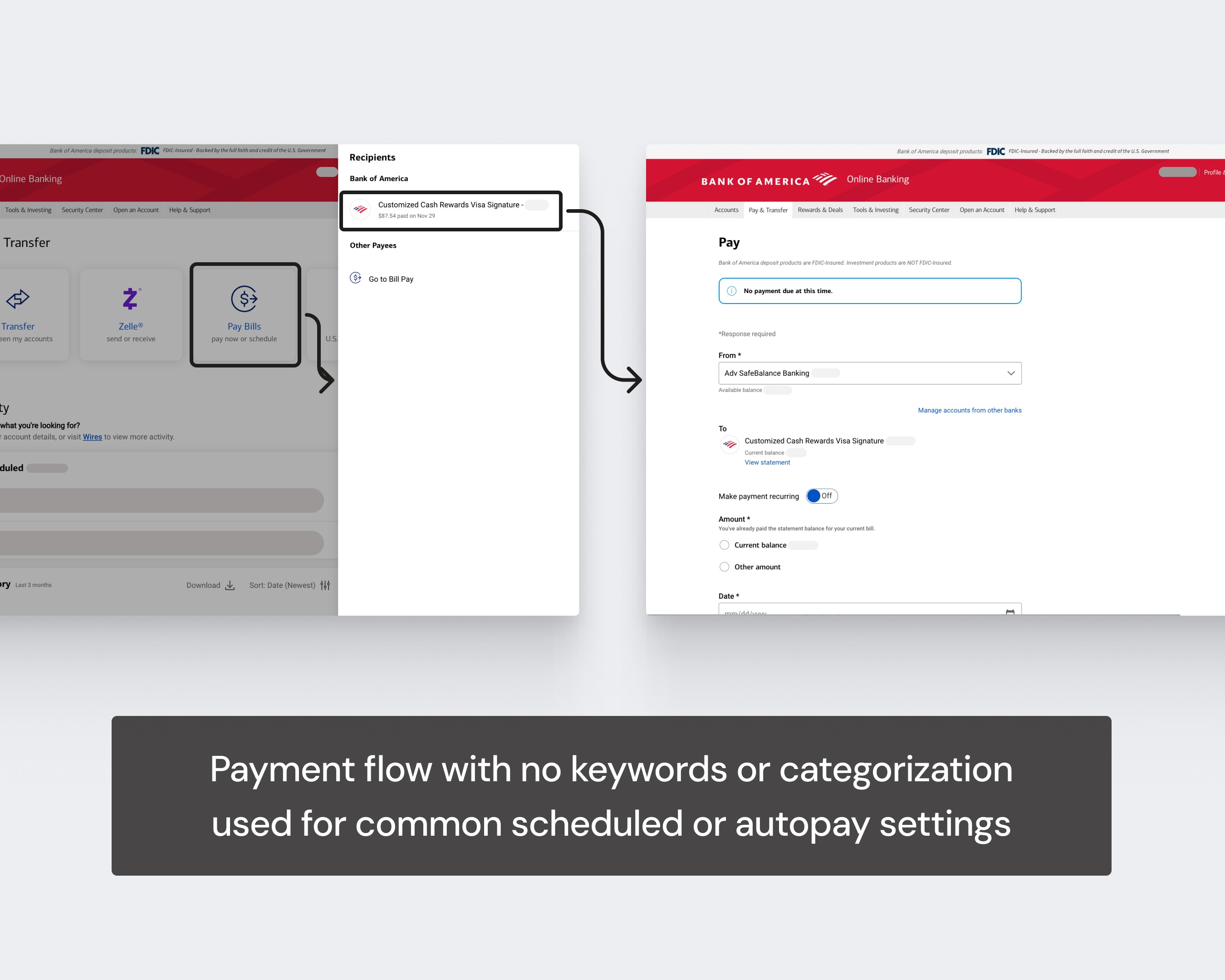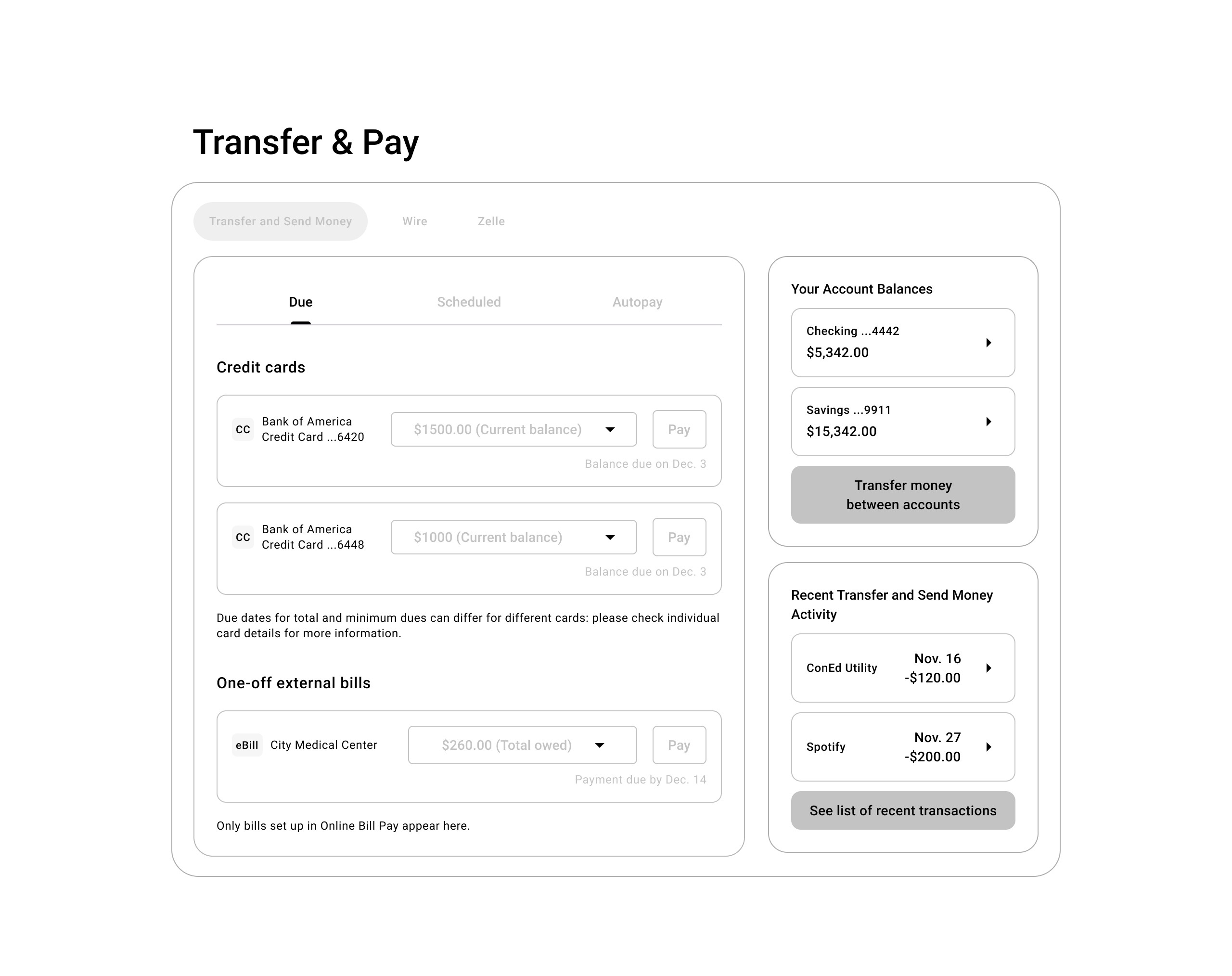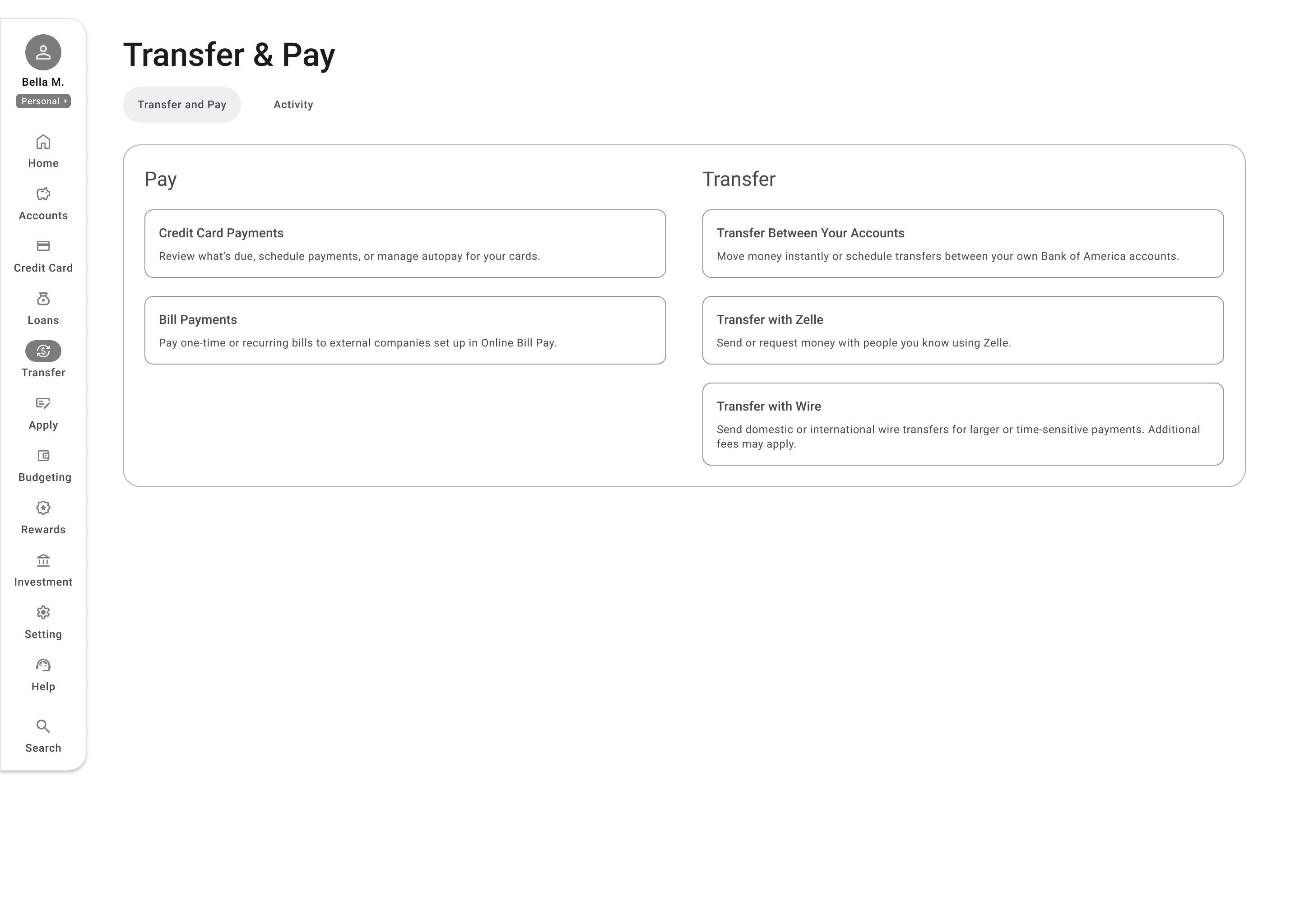 The 'Transfer & Pay' section didn't clearly separate different payment types; users couldn't tell if they needed 'Transfer,' 'Pay Bills', or something else. Critical actions like viewing scheduled payments or checking autopay settings were buried. This led to confusion, longer task times, and users taking the wrong path.