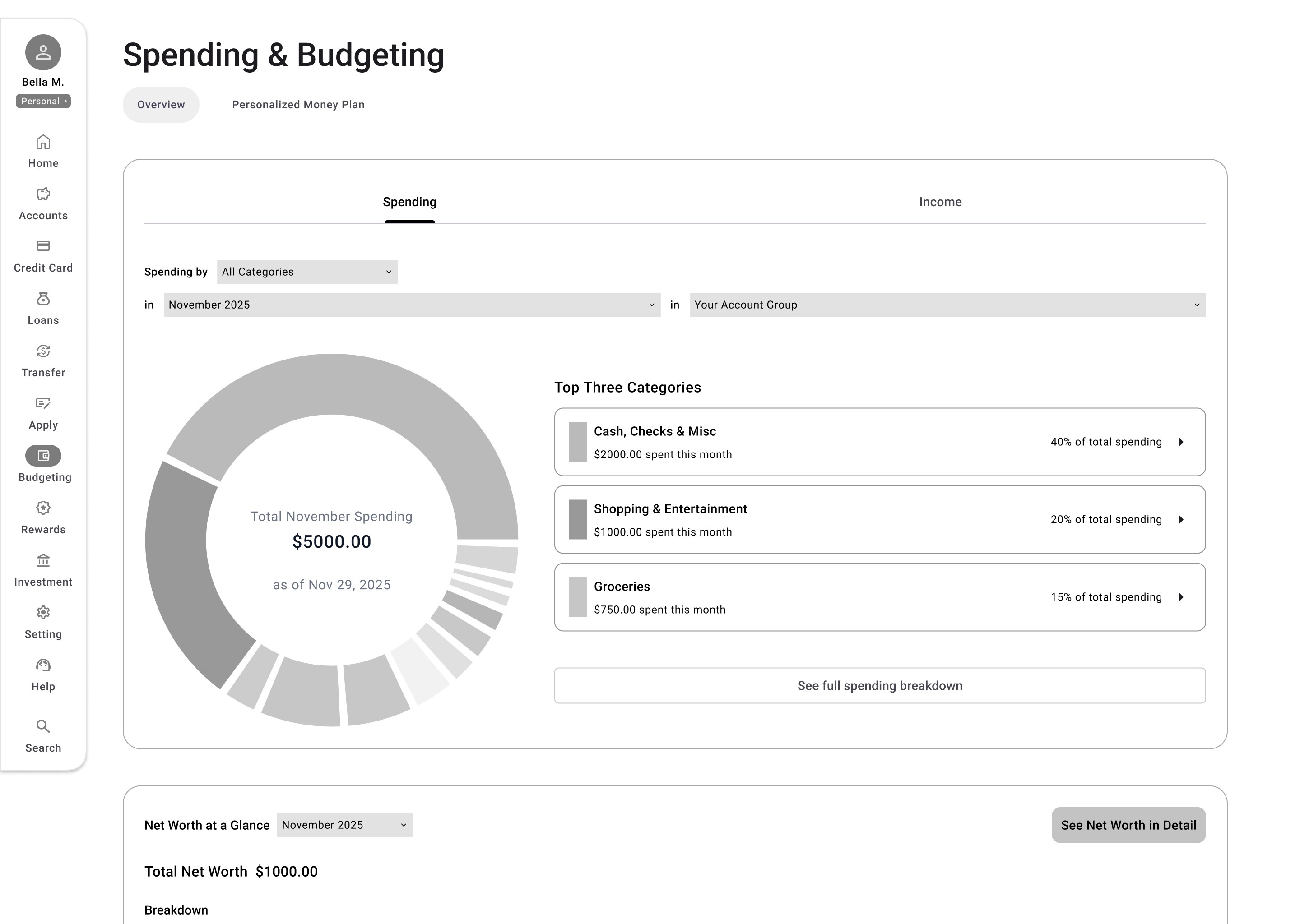 Users wanted quick access to spending insights, but BofA scattered related features across multiple pages ('Spending Tracker', 'Goals', 'Net Worth', 'Recent Activity'). I consolidated into one page with clear differentiation between spending analysis and income tracking.