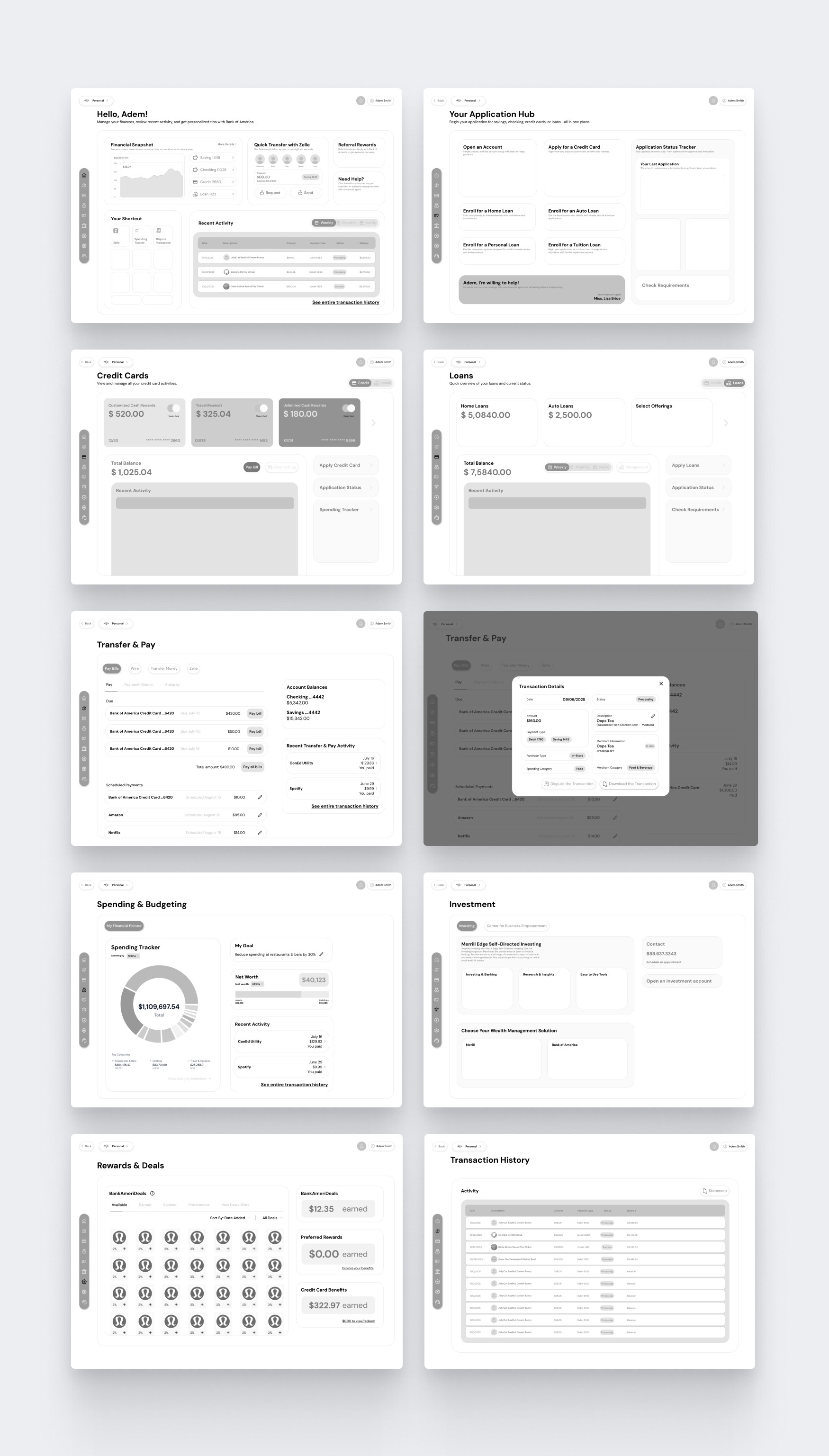 The redesign spans 8 key pages. Amy and I collaborated on research, IA testing, and initial wireframes. I led design for Transfer & Pay flows, Spending & Budgeting, Rewards & Deals, and Intelligent Search, while Amy focused on Account Overview, Credit Card Details, and Application flows.