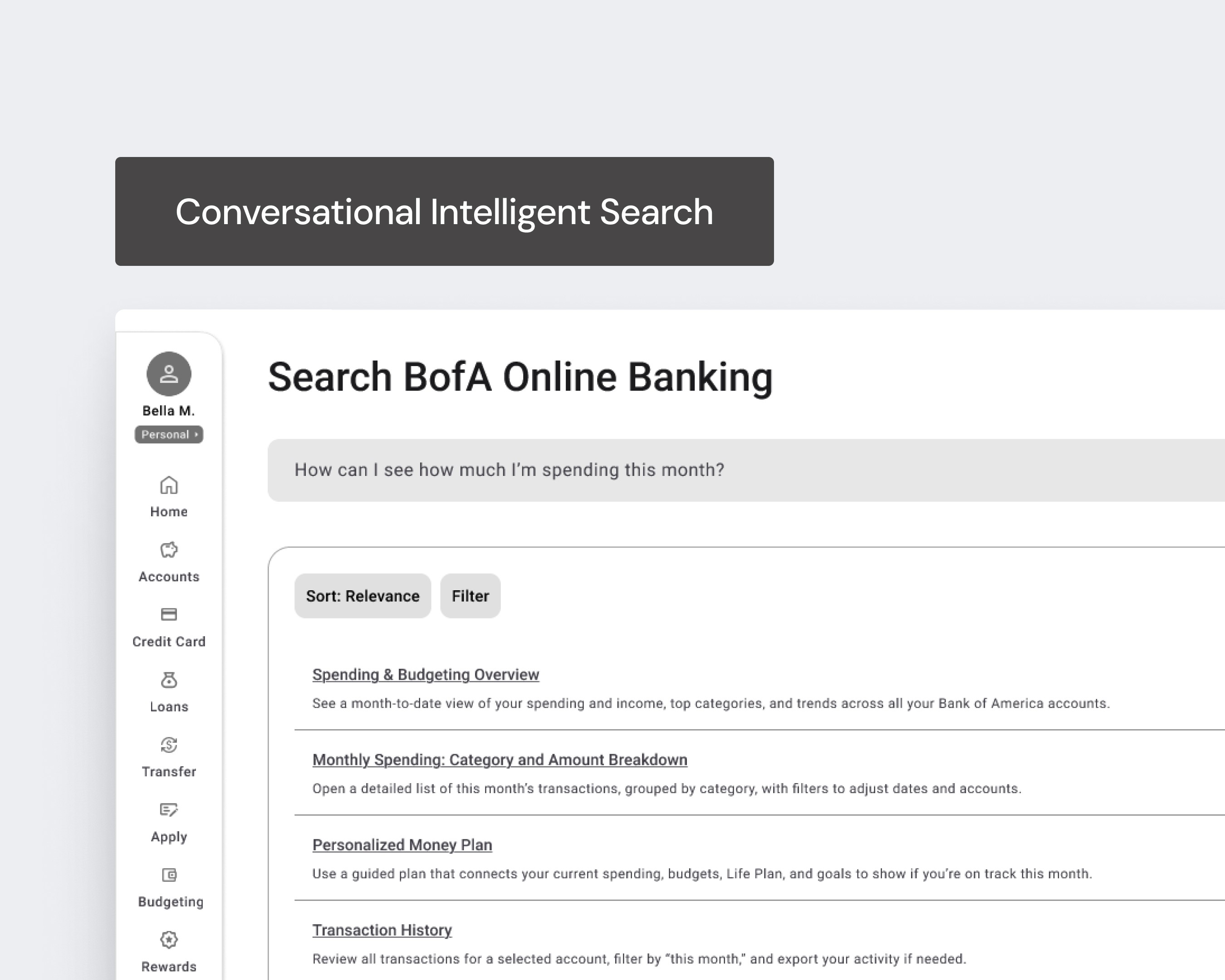This means: We propose intelligent search to serve the 43% of users who prefer search-first interactions (Gill, 2025), replacing BofA's underperforming search while complementing the navigation redesign.