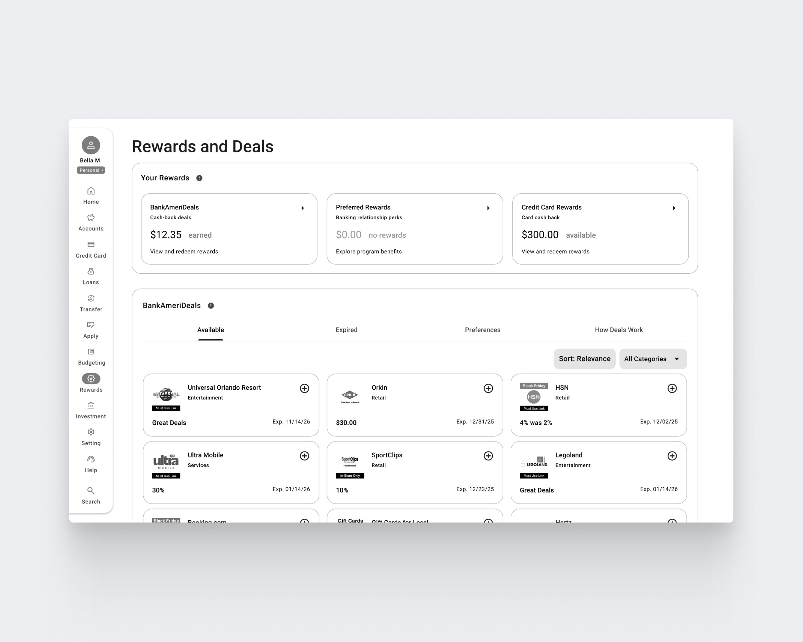 New BofA rewards and deals design with rewards to redeem at the top, and deals to add as you scroll down