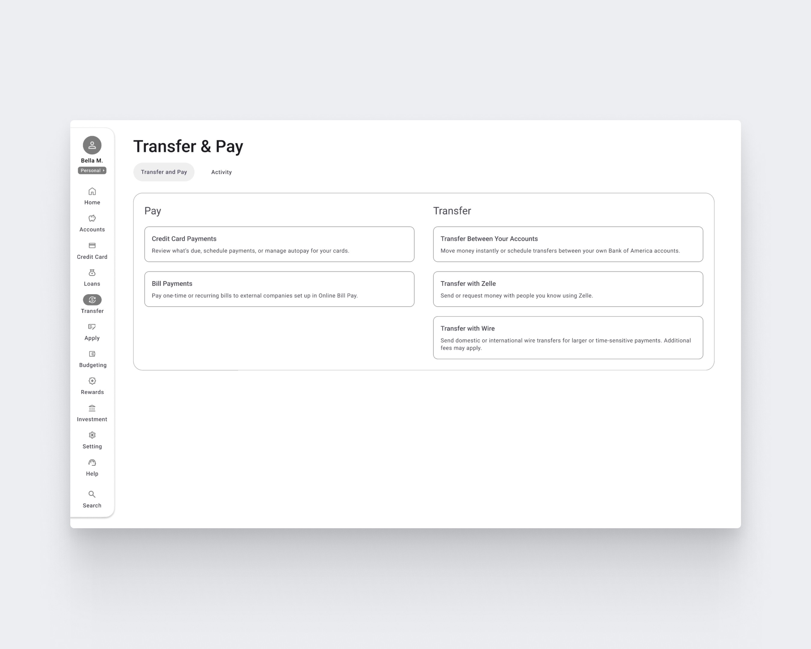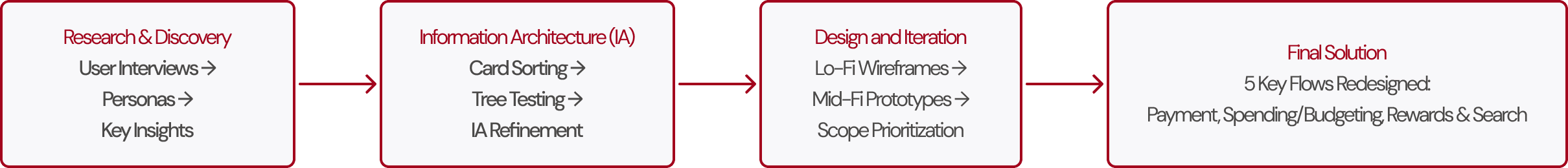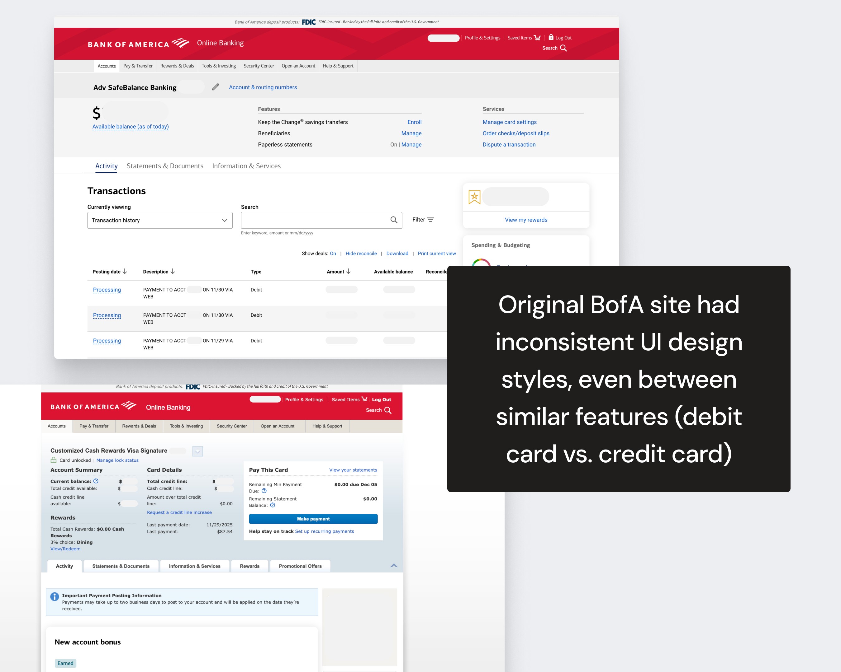 Beyond BofA, this project demonstrates how legacy banking interfaces accumulate features that get buried over time. The consolidation strategy - surfacing rewards, spending tracking, and payment options from nested pages while maintaining clear task separation - could serve as a model for how established institutions balance feature richness with beginner-friendly design.
