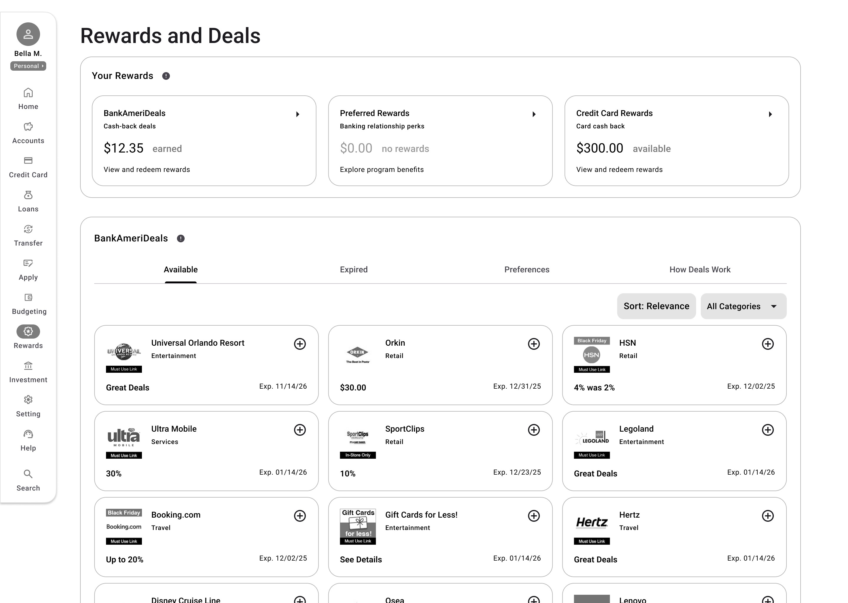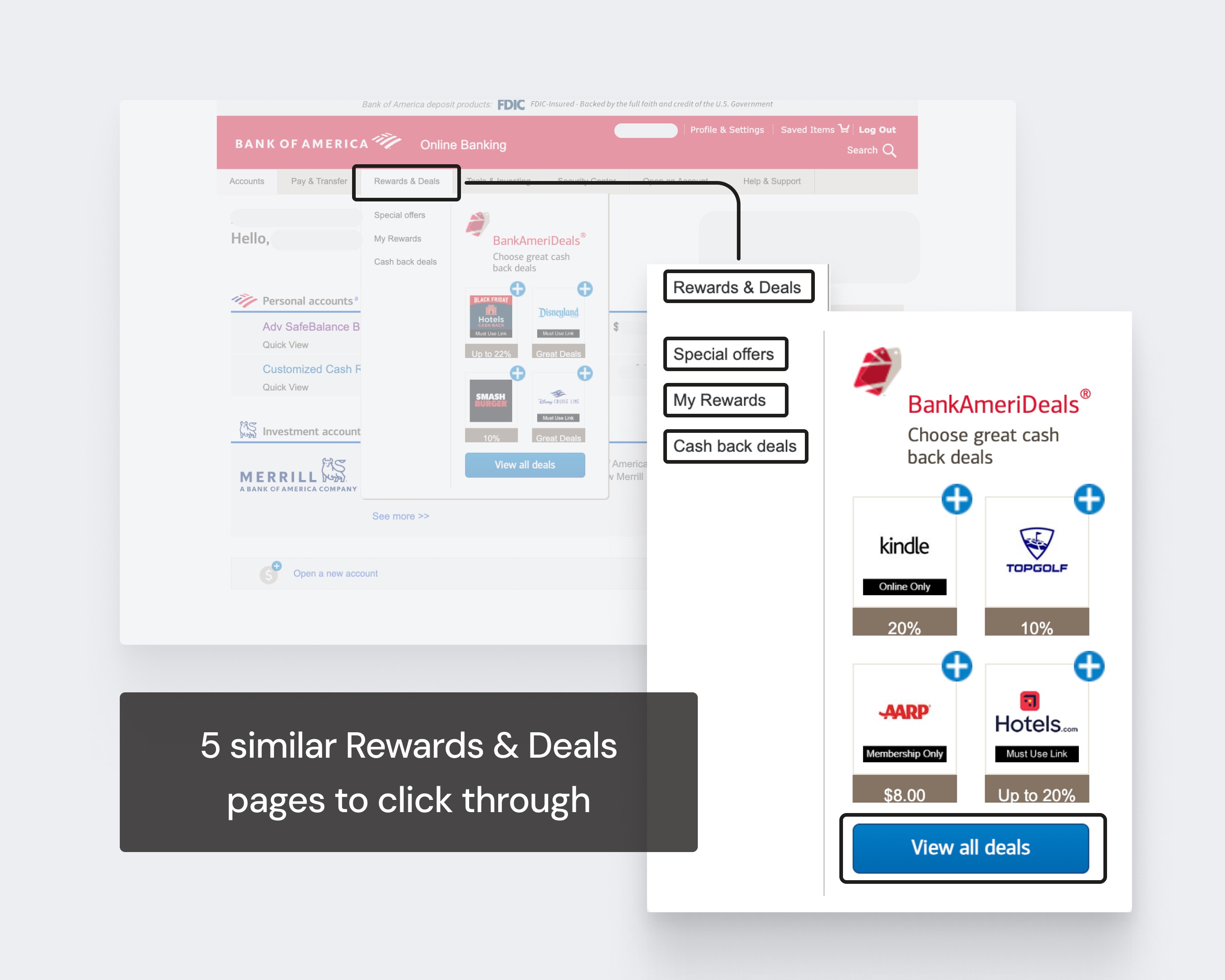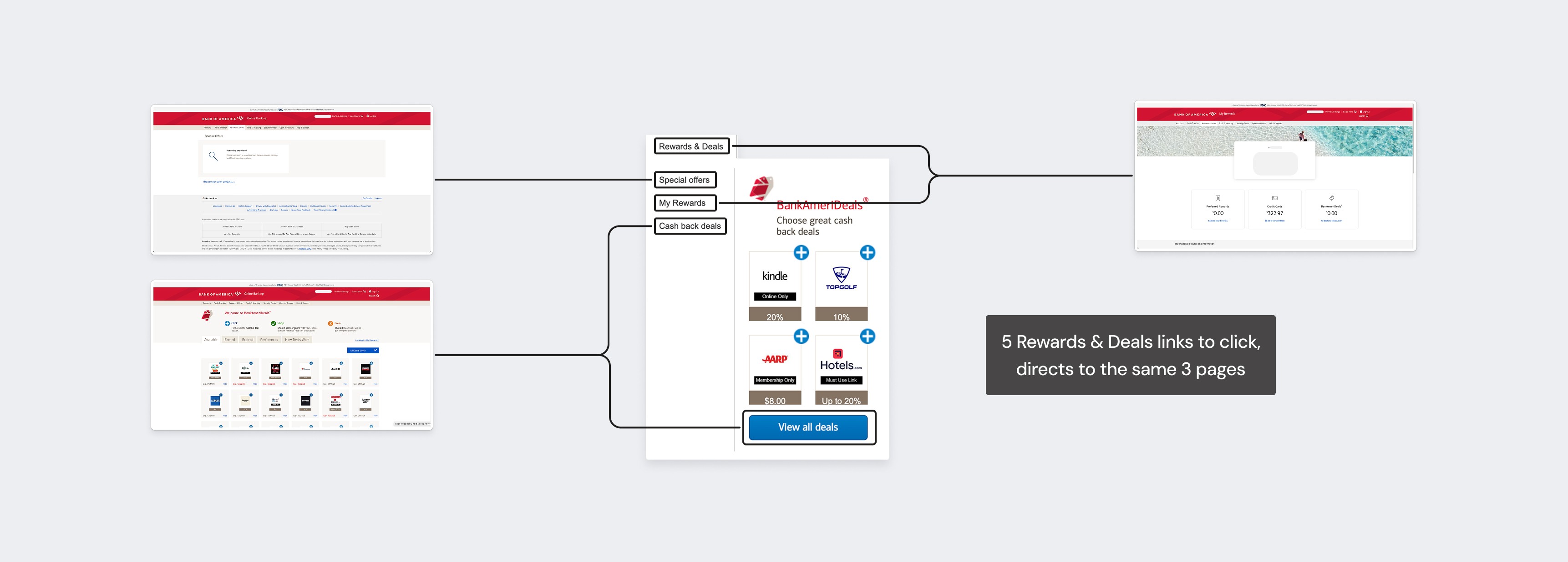 Users wanted quick access to deals, but BofA scattered them across 5 navigation links leading to 3 different pages. I consolidated everything into one searchable dashboard.