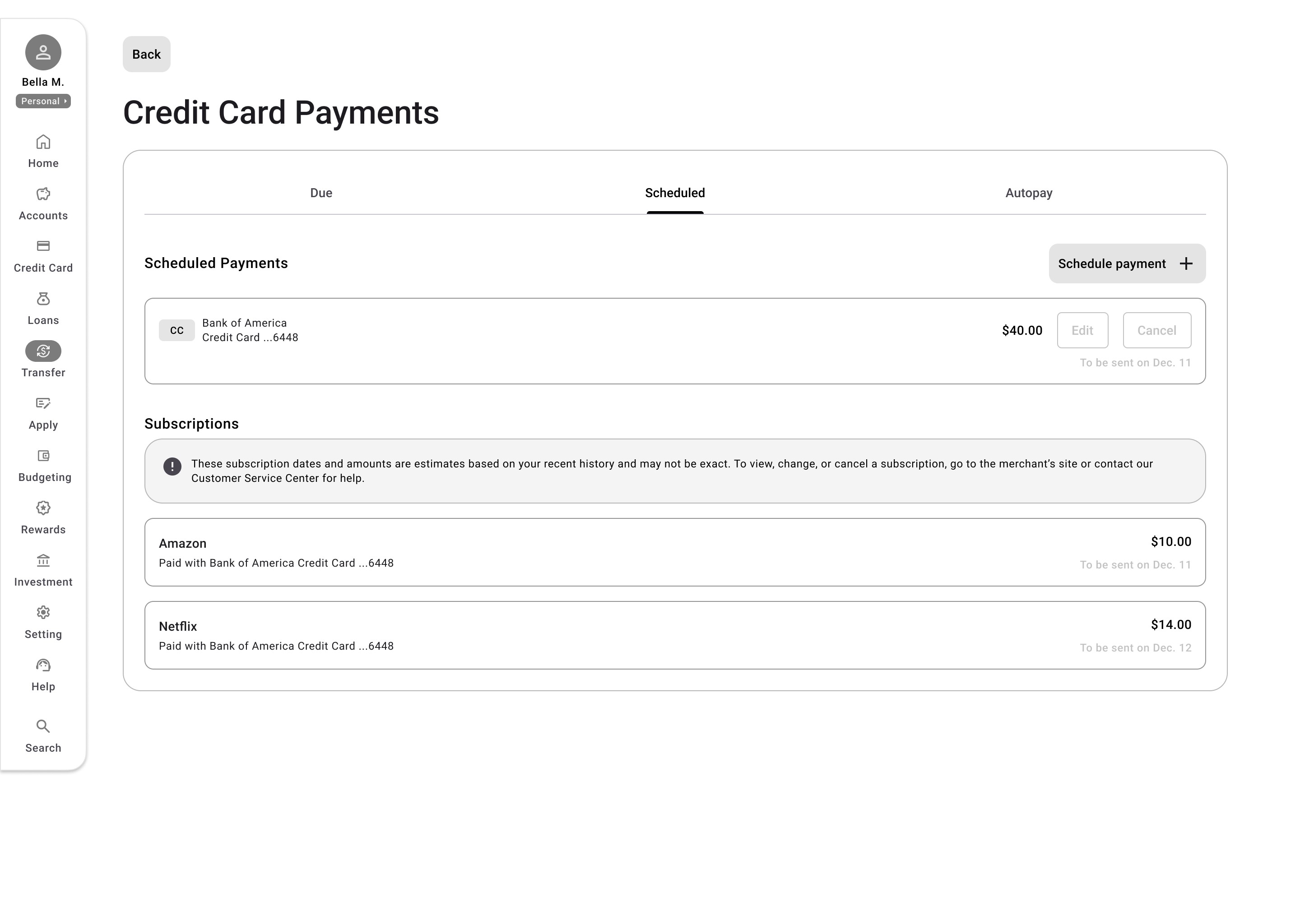 I worked collaboratively with my partner, Amy, on the initial research, card sorting, and tree testing. I led design for payment flows, budgeting, rewards, and search; Amy led account and credit card management, as well as the application flows.