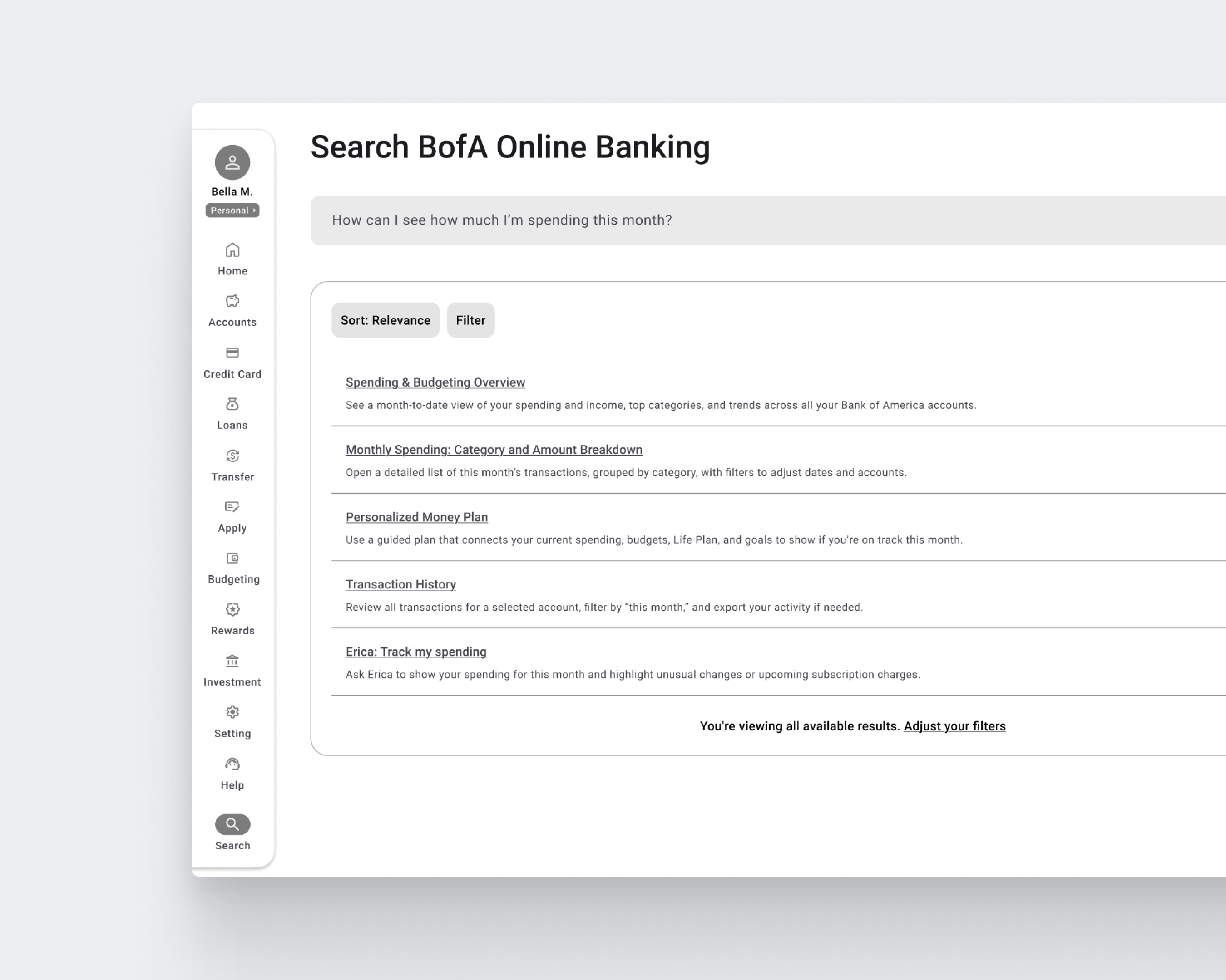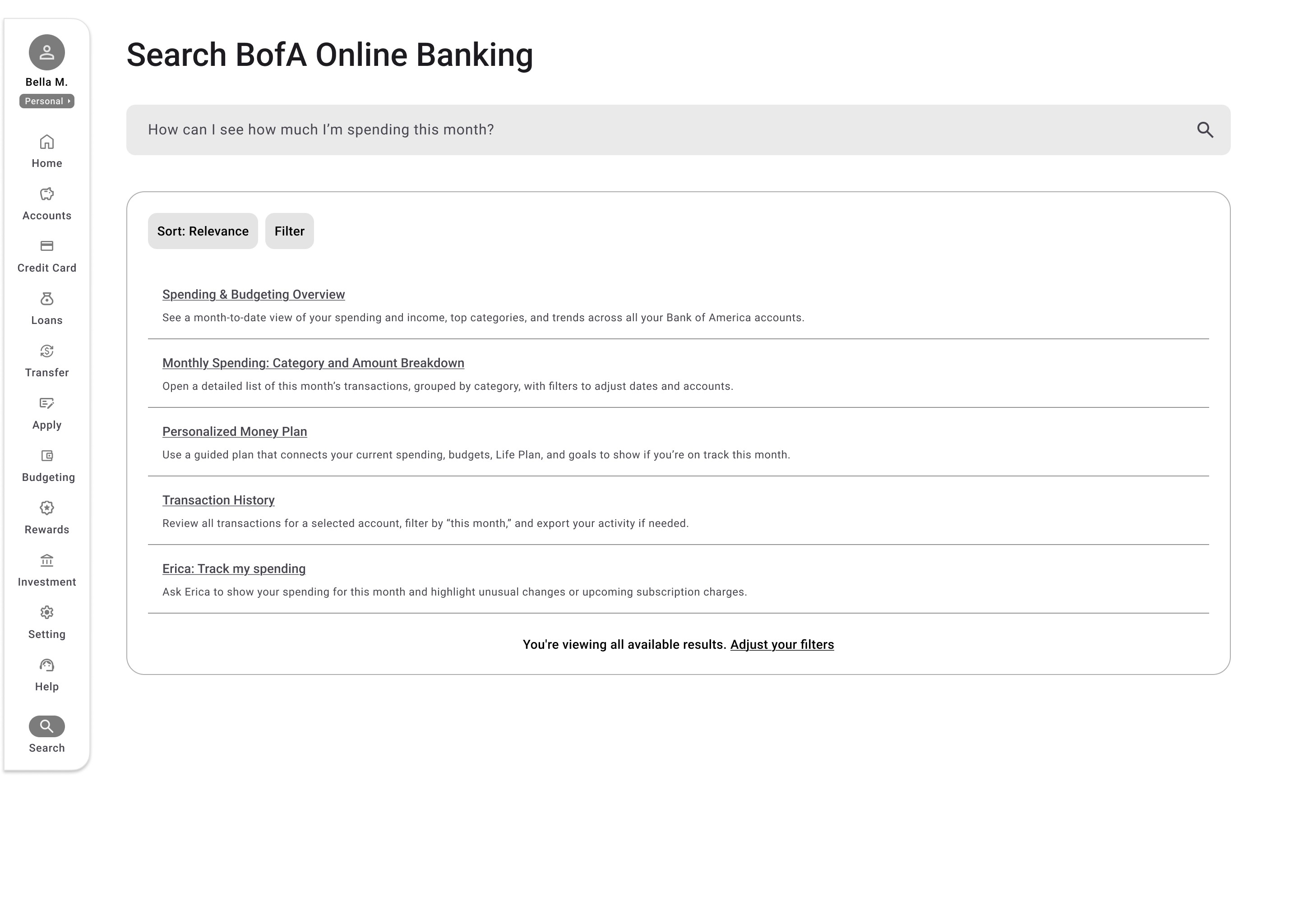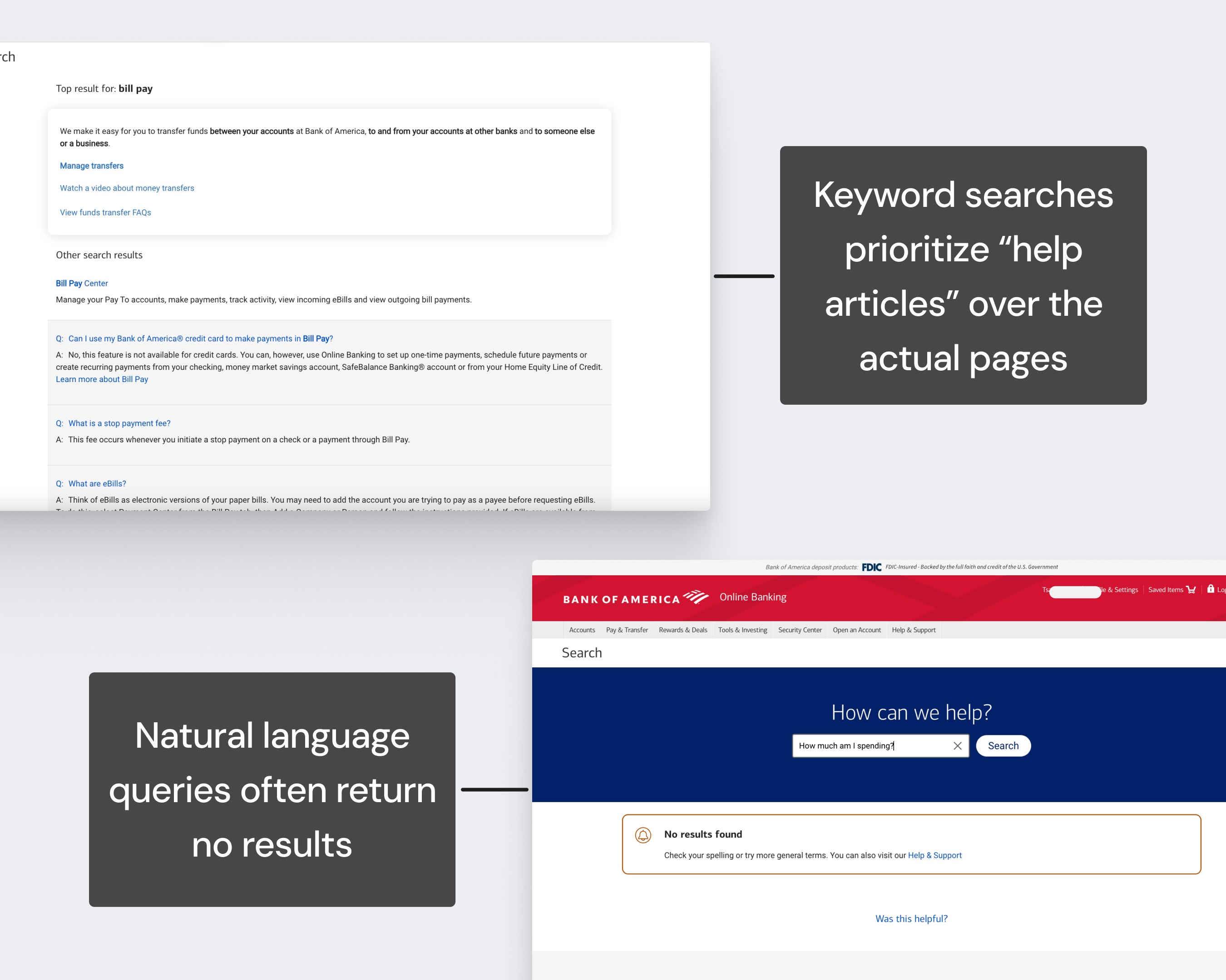 One tester specifically referenced ChatGPT's search-first approach. When I pointed out BofA's existing search, he said he'd never noticed it since it wasn't prominent in the navigation. Even when he tried it, he didn't like how it led to more FAQ pages to read through, "wasting his time."
