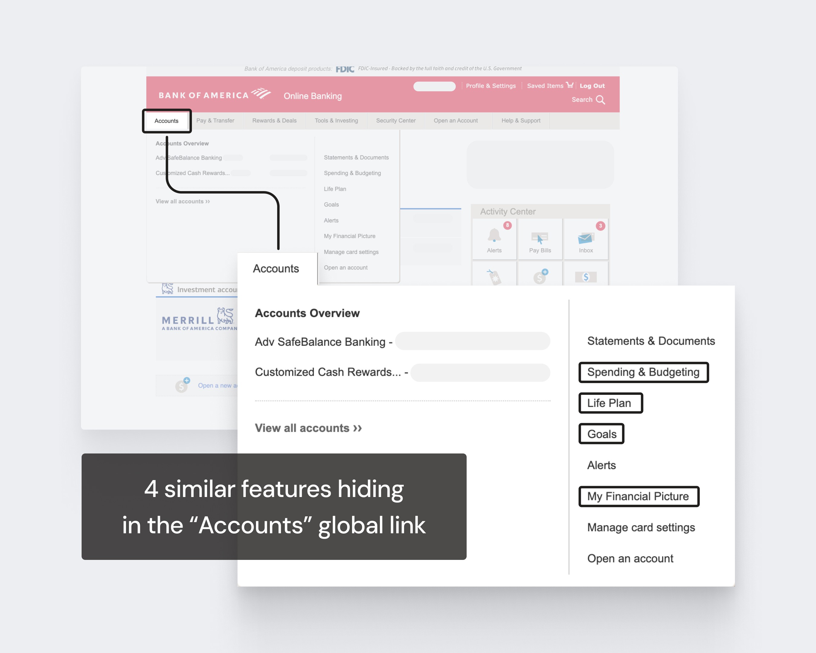 To redesign Bank of America's information architecture and key user flows, reducing cognitive load by consolidating fragmented navigation and clarifying multi-step banking tasks for users across experience levels.