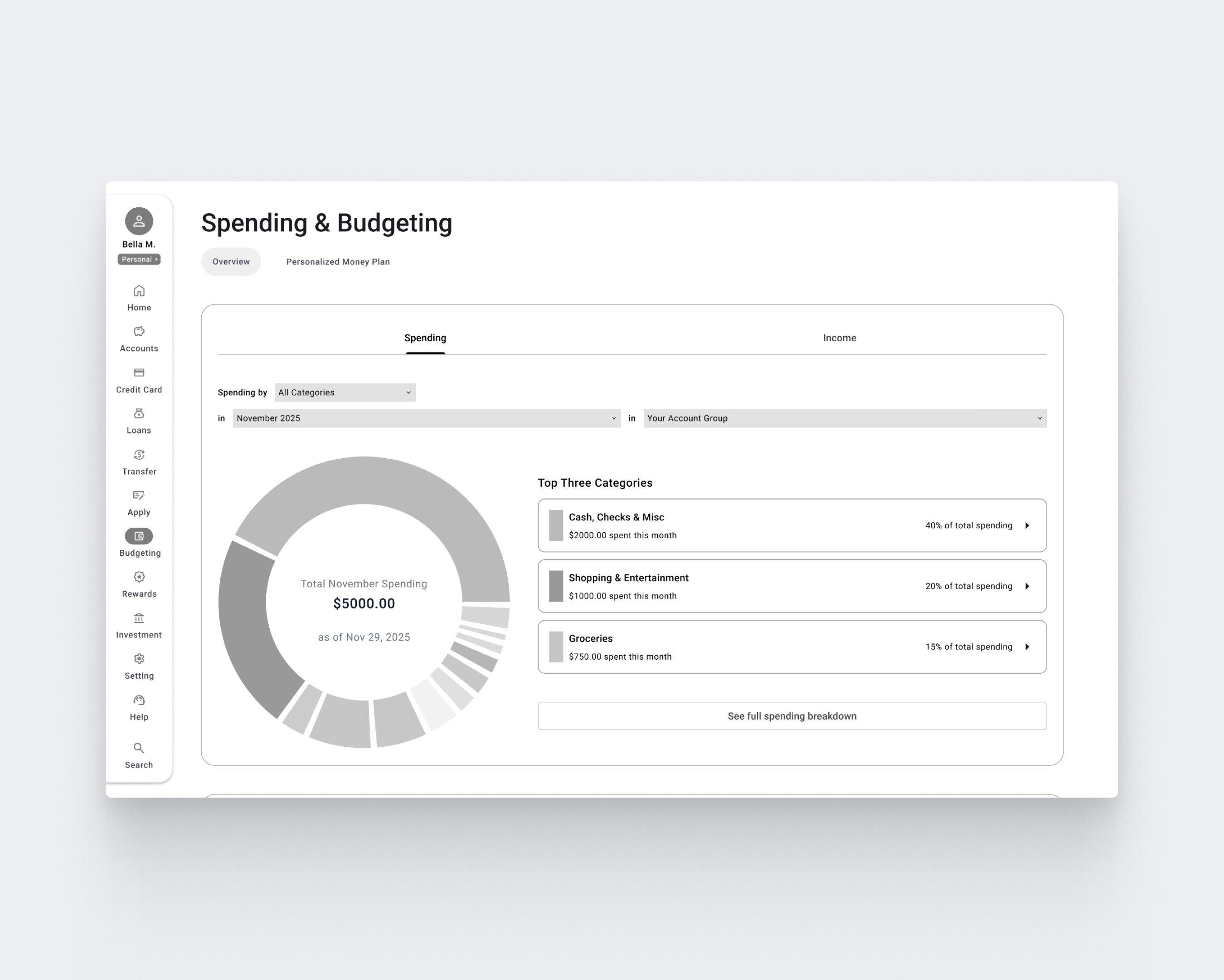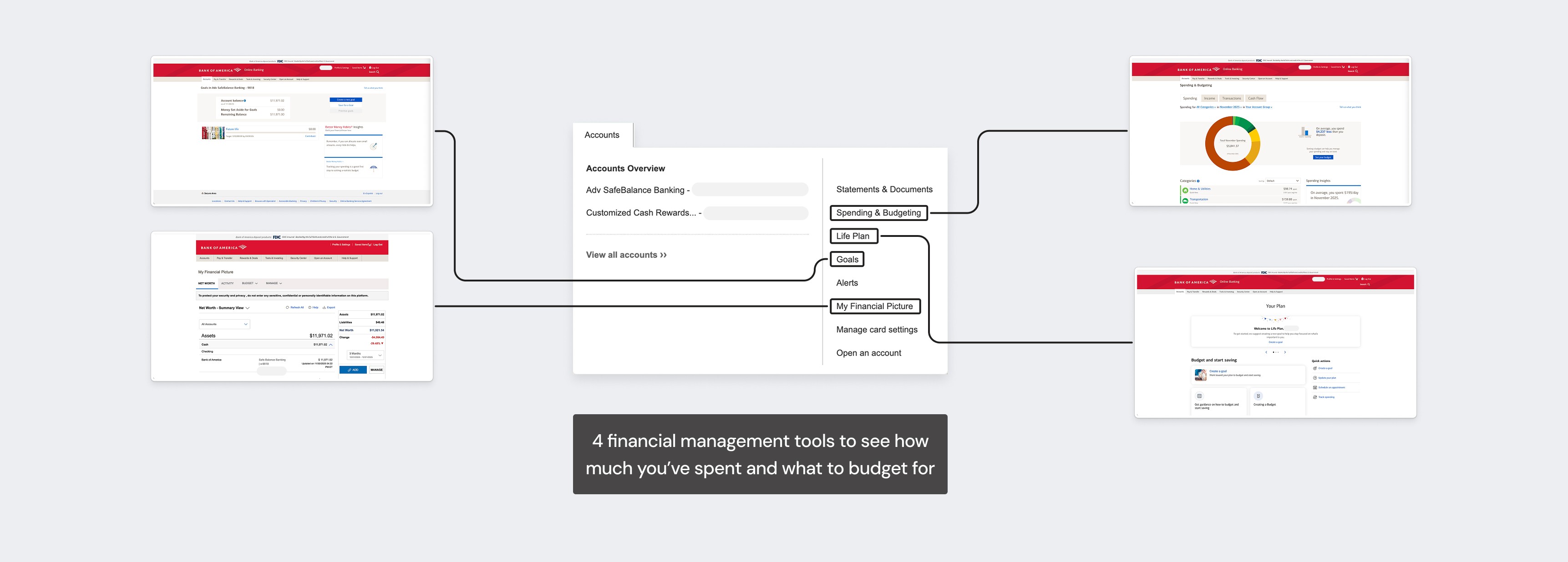 I consolidated scattered features into one page with two tabs. The 'Overview' tab (default view) shows past spending analysis - users come to their bank app to check what they've spent. The 'Personalized Money Plan' tab houses budgeting and goal-setting - a more holistic planning experience that extends beyond just BofA accounts, which I assumed users would access less frequently.