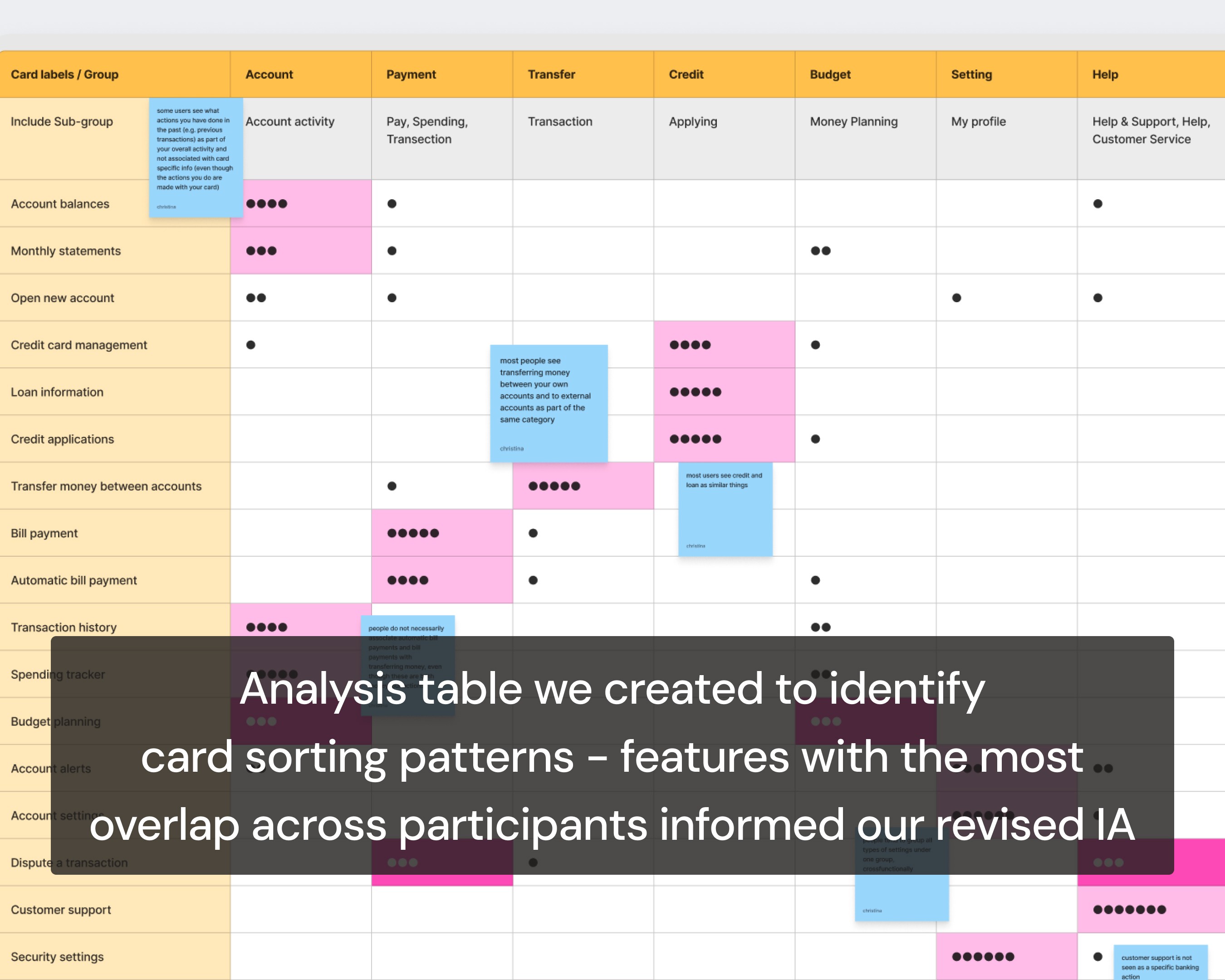 Since the IA structure worked, we focused on the page-level interactions to understand where users were really struggling. After validating our IA through card sorting and tree testing, we built lo-fi to mid-fi prototypes across 9 core screens: transfer/pay, dashboard, help/support, and account overview. We tested key task flows around the overall navigation experience with 4 participants to see where their real struggles lie.