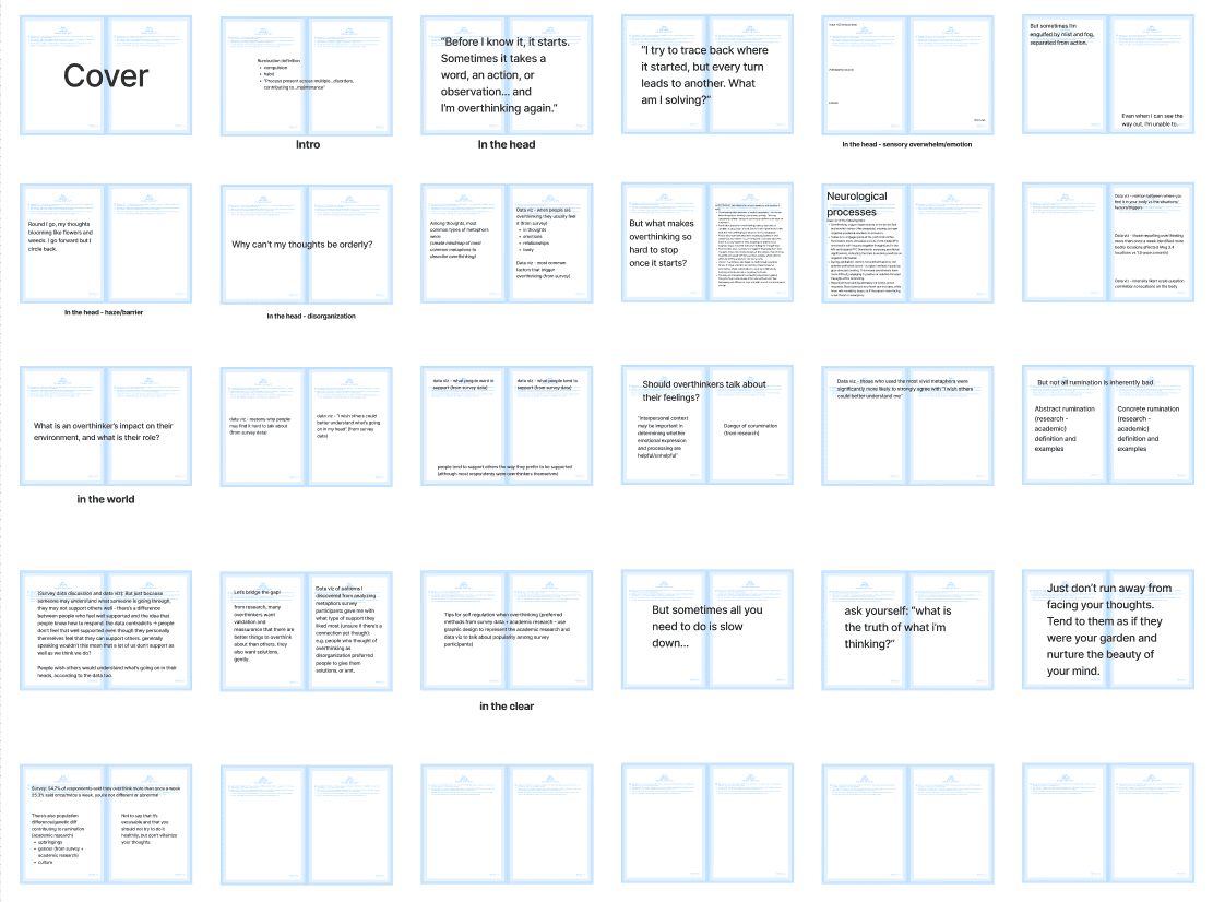 I mapped early publication concepts in FigJam, storyboarding how the narrative would unfold while mirroring the "overthinking garden" motif - from the first spark of a thought to its recursive cycle. Early user feedback helped refine the pacing and flow before I moved into visual design.